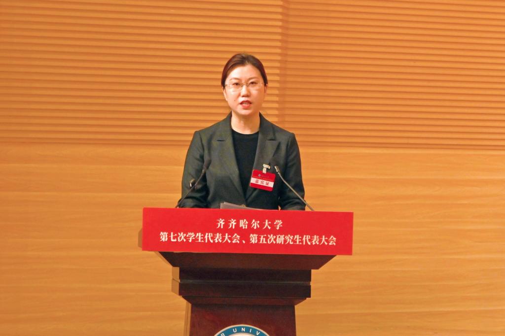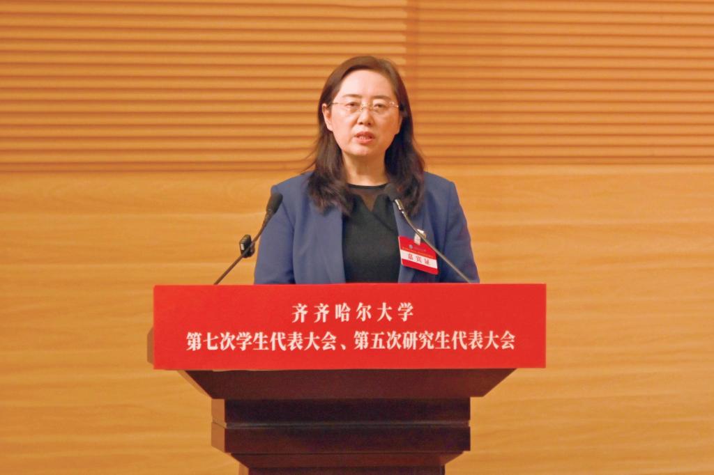 黨委書(shū)記丁宏代表學(xué)校黨委向大會(huì)的召開(kāi)表示熱烈祝賀,向各位領(lǐng)導(dǎo)、來(lái)賓的到來(lái)表示誠(chéng)摯歡迎,向各位代表和廣大青年學(xué)生致以親切的問(wèn)候!她指出,學(xué)生代表大會(huì)、研究生代表大會(huì)是學(xué)校聯(lián)系學(xué)生的橋梁和紐帶,是學(xué)生參與學(xué)校民主管理和民主監(jiān)督的重要組織形式。她強(qiáng)調(diào),各位學(xué)生代表要以飽滿的政治熱情和嚴(yán)肅的工作態(tài)度,認(rèn)真履行職責(zé),積極為學(xué)校事業(yè)高質(zhì)量發(fā)展獻(xiàn)計(jì)獻(xiàn)策、貢獻(xiàn)力量;廣大青年學(xué)生要堅(jiān)定不移聽(tīng)黨話、跟黨走,堅(jiān)定理想信念,勤奮刻苦學(xué)習(xí),勇于擔(dān)當(dāng)作為,自覺(jué)律己示范,用實(shí)際行動(dòng)踐行“請(qǐng)黨放心,強(qiáng)國(guó)有我”的錚錚誓言,以優(yōu)異表現(xiàn)彰顯齊大學(xué)子斗志昂揚(yáng)的精神風(fēng)貌,讓青春在中國(guó)式現(xiàn)代化的實(shí)踐中綻放絢麗之花!