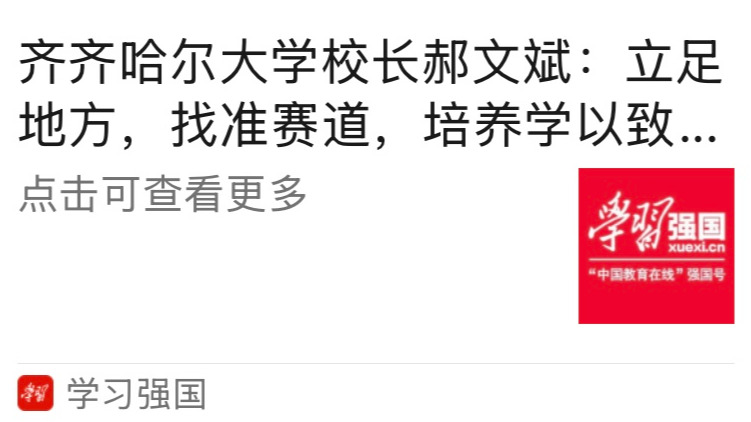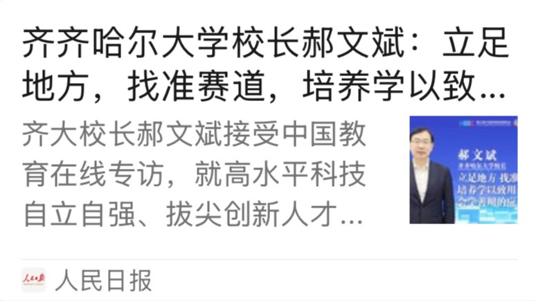 郝文斌:我覺得這是一個非常好的問題,也是對高校的一個現實考驗。之前也有過“錢學森之問”,如何把創新人才培養和國家重大戰略、未來發展有機結合?對于創新人才的培養,我認為,首先要厘清“創新人才”的內涵。我們國家有3000多所高校,不同類型、不同層次的高校,其辦學定位和目標任務是不同的。齊齊哈爾大學,屬于應用型大學,我們要找準我們的賽道,應用型大學和北大、清華等研究型大學建設世界一流大學的賽道是不一樣的。