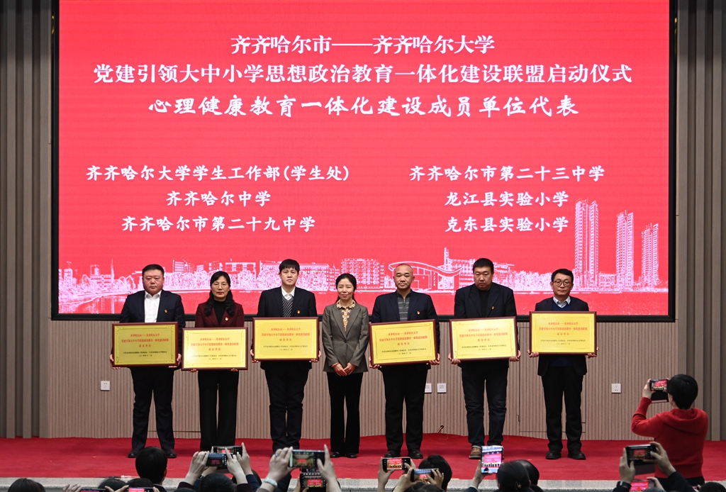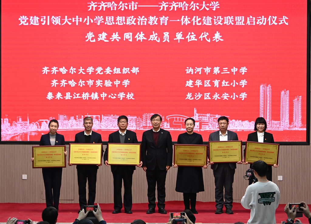 與會(huì)領(lǐng)導(dǎo)分別為“齊齊哈爾市—齊齊哈爾大學(xué)黨建引領(lǐng)大中小學(xué)思想政治教育一體化建設(shè)聯(lián)盟”成員單位代表授牌。