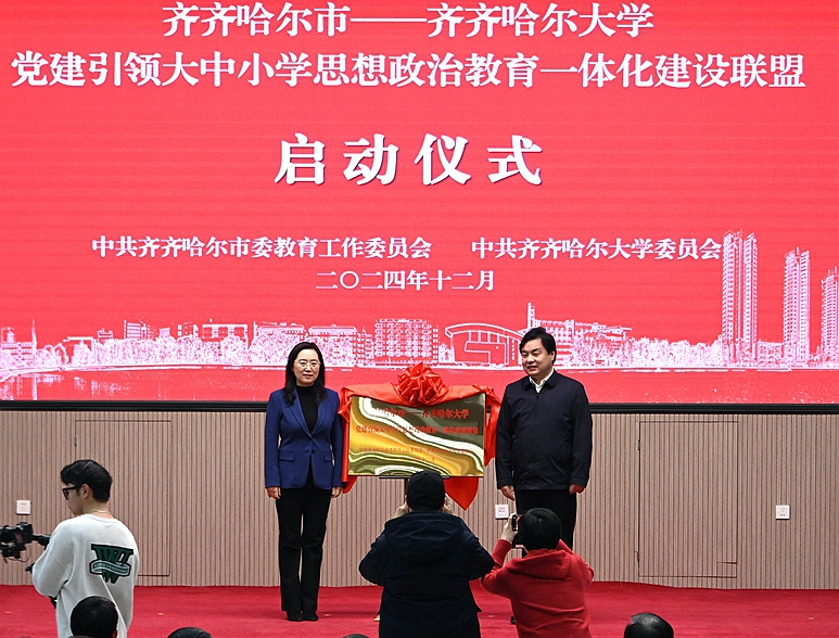 劉振江和丁宏一起為“齊齊哈爾市-齊齊哈爾大學(xué)黨建引領(lǐng)大中小學(xué)思想政治教育一體化建設(shè)聯(lián)盟”揭牌。