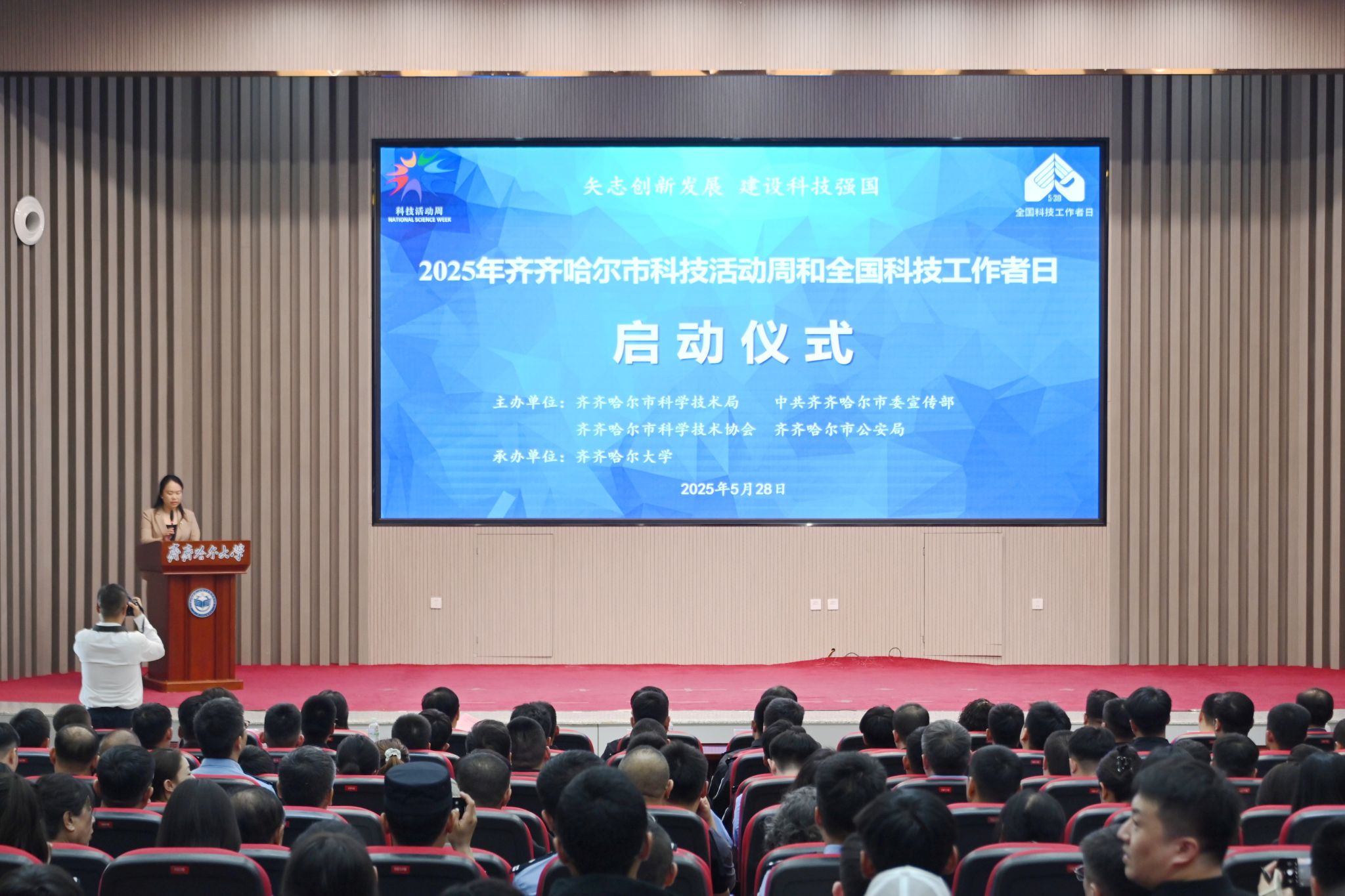 5月28日,2025年齊齊哈爾市科技活動周和全國科技工作者日啟動儀式在我校舉行,本次活動由市科技局、市委宣傳部、市科協、市公安局主辦,齊齊哈爾大學承辦。市委常委、副市長譚緒東,市人大常委會副主任戴曉霞,市政協副主席殷元虎出席啟動儀式,社會各界代表300余人參加活動。校長、黨委副書記郝文斌出席活動并致辭,副校長、黨委常委、組織部長馬文輝出席活動。
