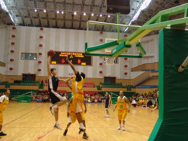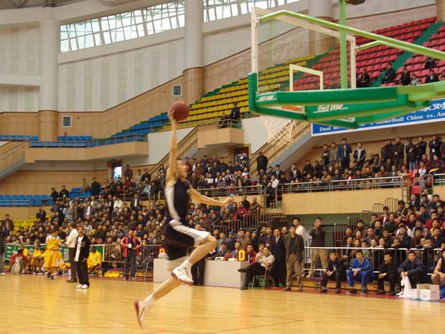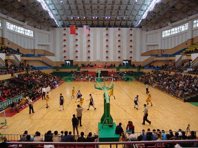 4月24日15時, 2005中美男子籃球?qū)官愒谖倚sw育館拉開戰(zhàn)幕。我市和我校有關(guān)領(lǐng)導(dǎo)及我校部分師生、鶴城各界群眾千余人在我校規(guī)模宏大、設(shè)施完備、設(shè)備先進的體育館現(xiàn)場觀看了比賽盛況。