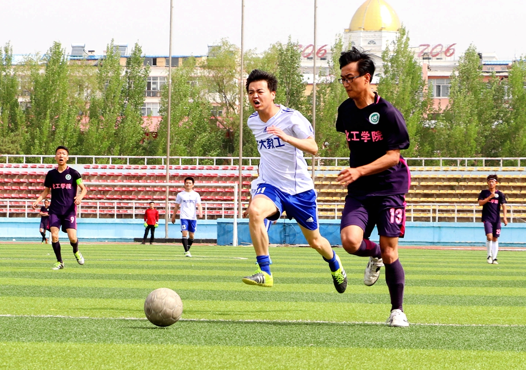 教職工隊(duì)是由來自學(xué)校各個部門、各個學(xué)院的老師組成的一支實(shí)力強(qiáng)勁的隊(duì)伍,比賽一開始,他們就有了不俗的表現(xiàn),打門、吊射對方球門,向?qū)Ψ桨l(fā)起了一系列的“狂轟亂炸”。而化工球隊(duì)也不甘示弱,作為富有朝氣的校園足球聯(lián)賽冠軍隊(duì),同學(xué)們對教職工隊(duì)的進(jìn)攻游刃有余地不斷回應(yīng)著,也多次展現(xiàn)出了完美的配合。由于實(shí)力上雙方勢均力敵,上半場經(jīng)歷了漫長的拉鋸戰(zhàn),雙方相繼打門成功,比分變成了1:1,上半場比賽也落下了帷幕。