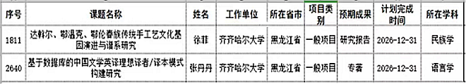 日前,全國哲學社會科學工作辦公室發布2022年國家社會科學基金年度項目和青年項目評審結果,我校美術與藝術設計學院徐菲老師申報的《達斡爾、鄂溫克、鄂倫春族傳統手工藝文化基因演進與譜系研究》和外國語學院張丹丹老師申報的《基于數據庫的中國文學英譯理想譯者/譯本模式構建研究》獲批國家社科基金一般項目,這是張丹丹老師第二次獲批國家社科基金項目。目前,外國語學院已獲批3項國家社科基金項目,美術與藝術設計學院已獲批2項國家社科基金項目。