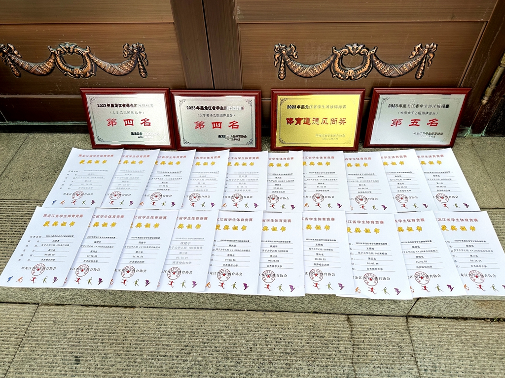 6月10-11日,2023年黑龍江省學生游泳錦標賽暨第一屆全國學生(青年)運動會黑龍江省學生游泳項目選拔賽在東北林業大學舉行。經過兩天的激烈角逐,我校游泳隊團體總分榮獲大學乙組團體第四名,并獲得大學男子乙組團體總分第四名,大學女子乙組團體總分第五名,男子乙組4x100米混合接力第三名,4x100米自由泳接力第四名的好成績。參賽隊員段建宇獲得50米蛙泳第二名并達到一級運動員標準,并獲得100米蛙泳第三名;陳常思獲得50米自由泳第二名,50米蝶泳第五名;朱承熹獲得200米仰第二名,50米仰泳第四名;曾天放獲得100米蛙泳第六名,200米混合第四名;王澤旭獲得100米蝶泳第五名,50米蝶泳第六名。
