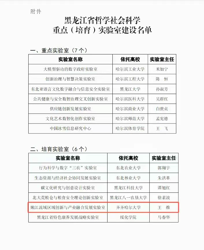 近日,黑龍江省哲學社會科學重點(培育)實驗室建設名單公布,我校申報的“嫩江流域區域創新與產業融合發展實驗室”獲批培育立項建設,實現我校文科科研平臺新突破。