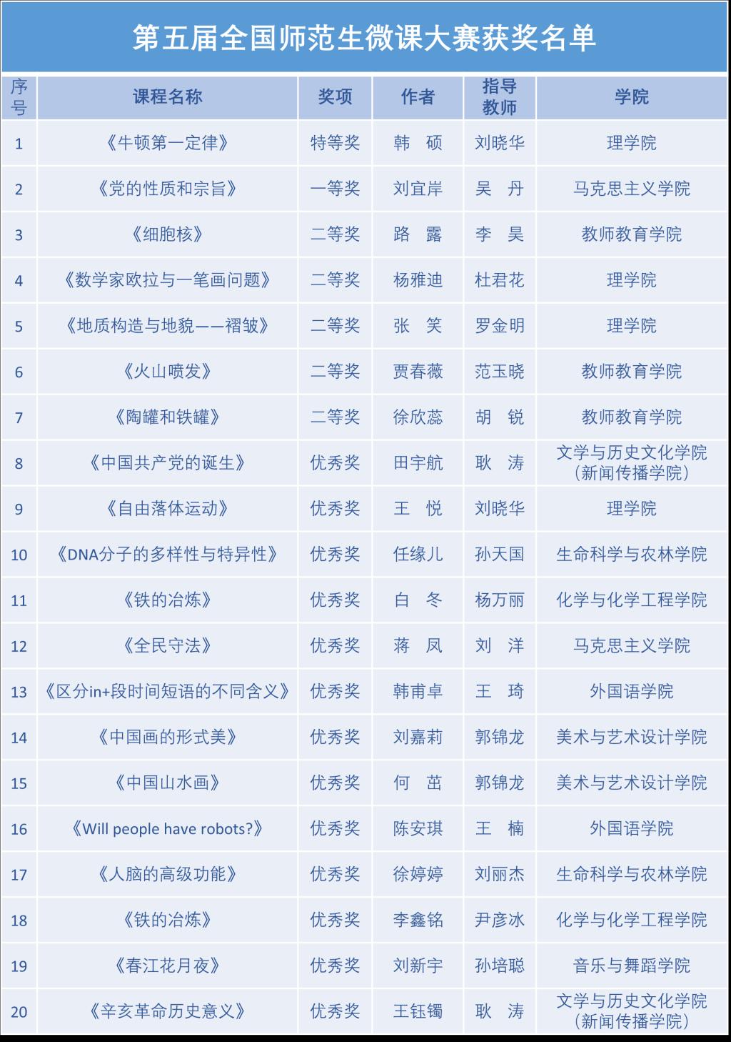 近日,第五屆全國師范生微課大賽獲獎名單揭曉,我校學生在本次大賽中脫穎而出,獲得一個特等獎,一個一等獎,五個二等獎,十三個優秀獎的優異成績。