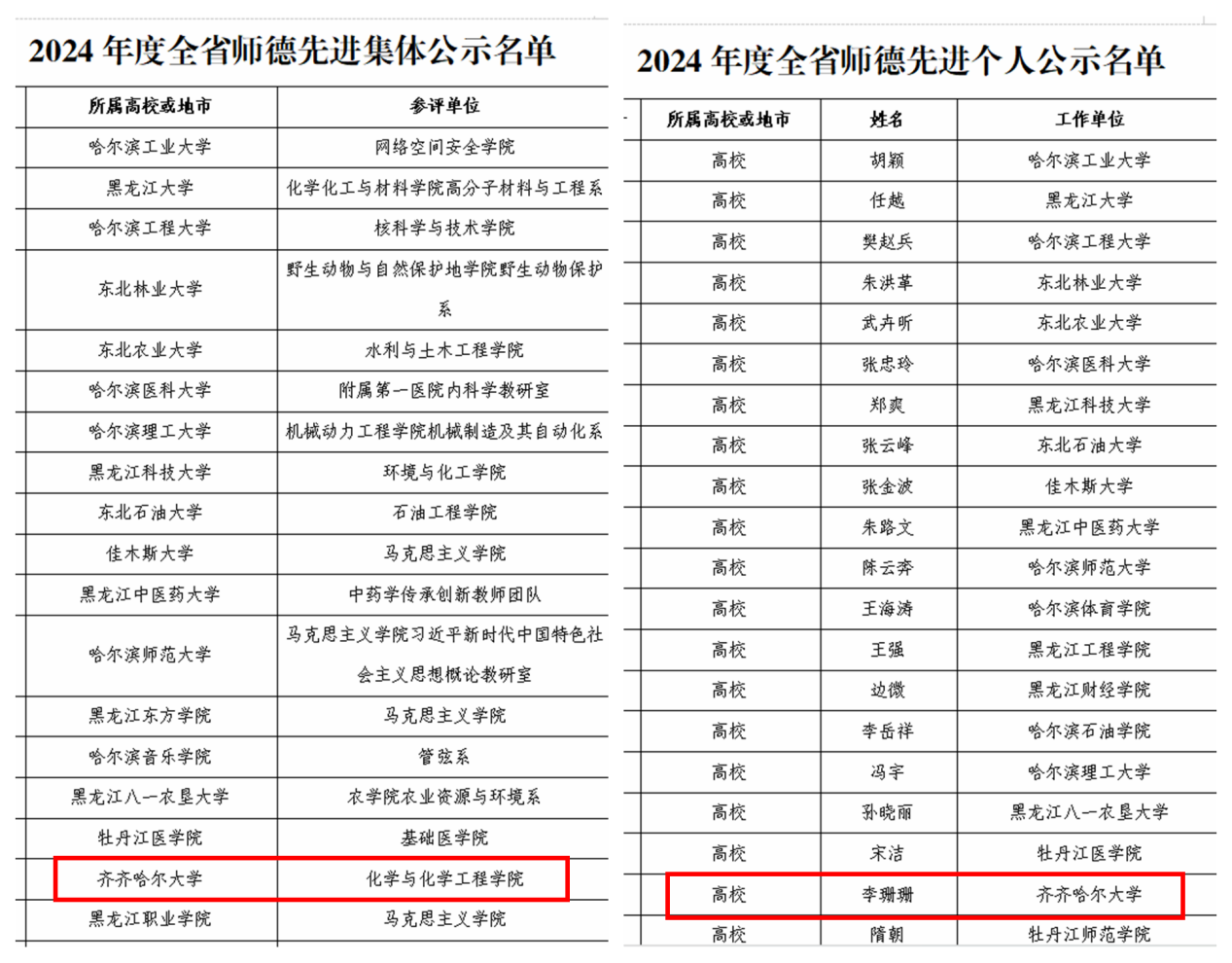 日前,黑龍江省教育廳公布了2024年度全省教育系統師德先進集體和先進個人的評選結果,我?;瘜W與化學工程學院榮獲“2024年度全省教育系統師德先進集體”榮譽稱號、生命科學與農林學院李珊珊教授榮獲“2024年度全省教育系統師德先進個人”榮譽稱號。