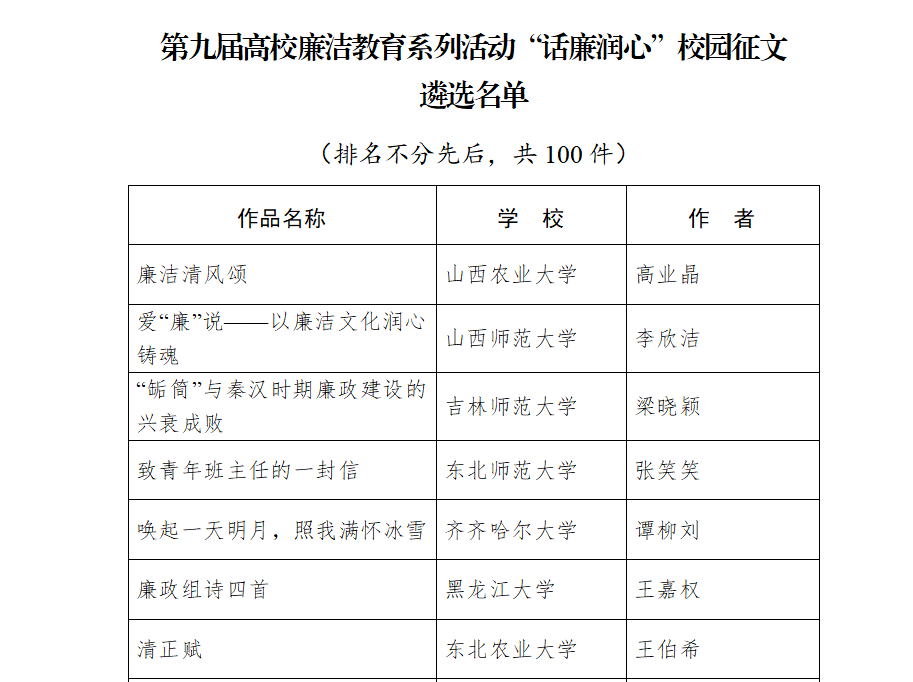 近日,教育部公布《關于第九屆高校廉潔教育系列活動結果的公示》,我校馬克思主義學院譚柳劉同學的作品成功入選“話廉潤心”校園征文教育部遴選名單。這是繼2023年我校馬克思主義學院徐光迪同學的作品《大雨》獲教育部第八屆高校廉潔教育系列活動“廉心文語”校園征文優秀作品獎之后的又一榮譽。
