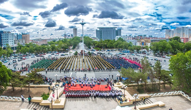 3500人共同演奏了《我和你》《歡樂的達斡爾》《我愛你塞北的雪》三首曲目,或舒緩溫情、或激昂歡快、或優美深情,拉開了丁笛演奏的序幕;其場面壯觀,令人震撼。