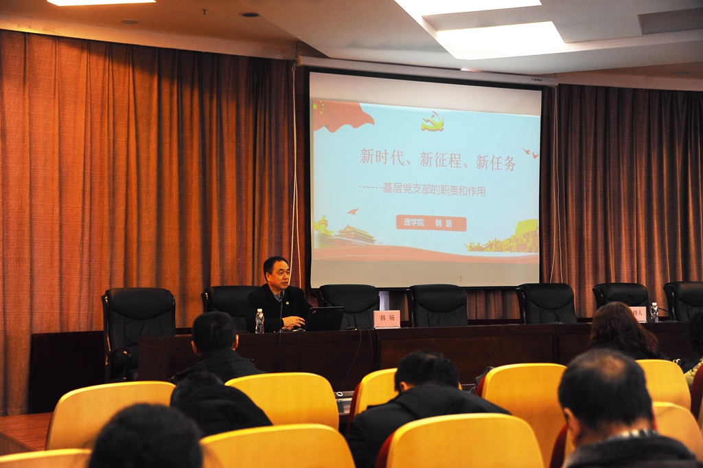 理學院黨委書記韓旸以《新時代、新征程、新任務——基層黨支部的職責和作用》為題,通過“數”說新時代、新征程、新任務,基層黨支部的職責及作用,高校基層支部如何做好黨建工作等三部分內容,詳細闡述了基層黨支部的職責和作用。