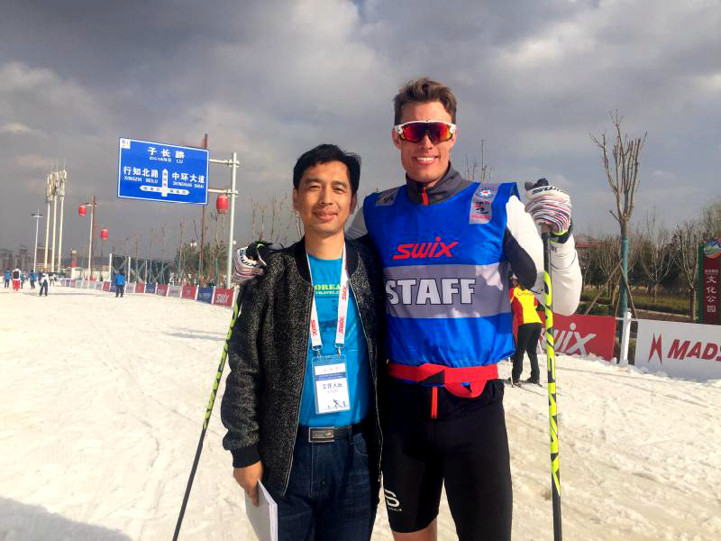 (李金輝老師與挪威運動員、平昌冬奧會三金得主克萊博合影)