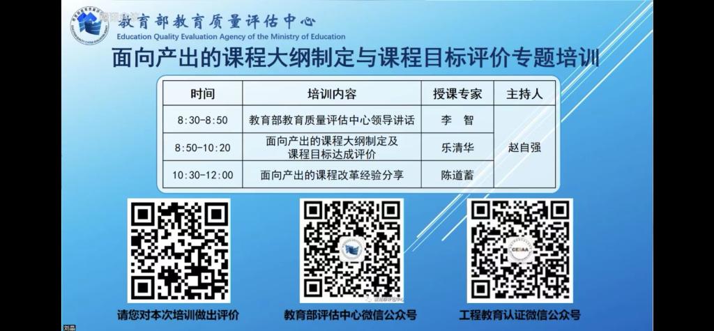 按照學校通知要求,為扎實推進我院工程教育專業認證工作,落實好教學課程大綱制定和課程目標評價,我院組織全院教師于8月4日上午通過騰訊會議在線參加教育部教育質量評估中心召開的專題培訓。