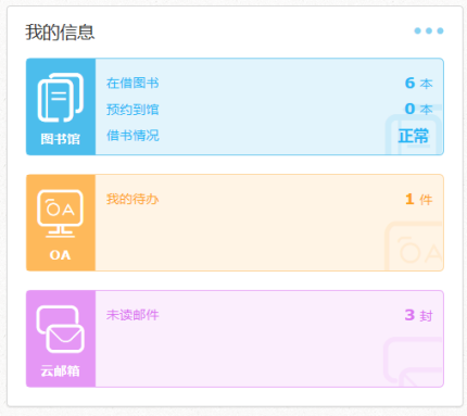 此處放置個(gè)人常用的與智慧校園系統(tǒng)集成的應(yīng)用信息系統(tǒng),目前包括OA協(xié)同辦公系統(tǒng)、校園郵件系統(tǒng)、圖書(shū)管理系統(tǒng)。各個(gè)系統(tǒng)點(diǎn)擊對(duì)應(yīng)的圖標(biāo)或文字,即可直接進(jìn)入,無(wú)需再次輸入賬號(hào)密碼。