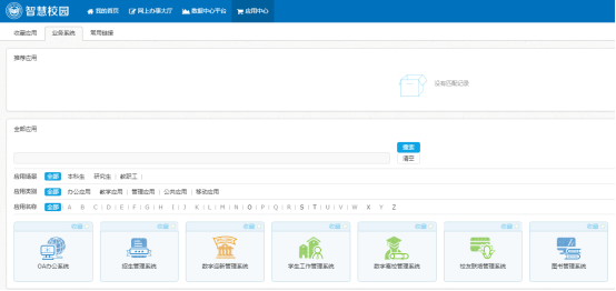 (2) 點(diǎn)擊應(yīng)用中心后,會(huì)顯示出各部門(mén)與智慧校園相關(guān)聯(lián)的相關(guān)應(yīng)用系統(tǒng)。