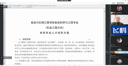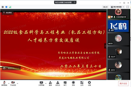 為進一步深化校企合作發展,提升人才培養質量,適應企業發展需求,3月30日上午9:00,我院食品科學與工程專業和黑龍江飛鶴乳業有限公司通過騰訊會議聯合召開“飛鶴班”人才培養方案線上研討會。學院副院長鄧永平、食品科學與工程專業主任王巖、黑龍江飛鶴乳業有限公司人事經理張吉坤、生產事業部經理李洪才、生產事業部高級工藝工程師謝陽、甘南分公司生產經理李楠、哈爾濱分公司實驗室主任劉芳玉等相關人員參加會議,會議由食品科學與工程專業主任王巖主持。