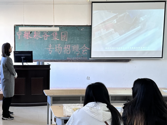為深入實施就業優先戰略,讓我院應屆生了解就業行情,明確就業的信心,充分發揮校園招聘主渠道作用。我院于2023年10月26日下午2點30分在延德樓330多媒體教室舉辦中糧糧谷集團專場招聘會。本次活動由中糧糧谷公司工作人員主講,我院部分20級應屆生參加此次活動。
