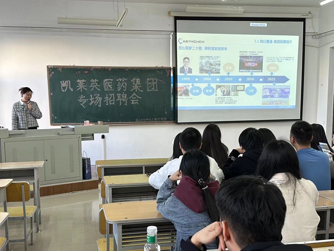招聘會開始時,李陽首先介紹了集團,這讓我院學生了解到凱萊英醫藥集團是一家全球領先、技術驅動型的CDMO一站式綜合服務商。該集團為國內外的制藥公司、Biotech公司提供藥品全生命周期的一站式CMC服務、高效和高質量的研發與生產服務,加快創新藥的臨床研究與商業化應用。