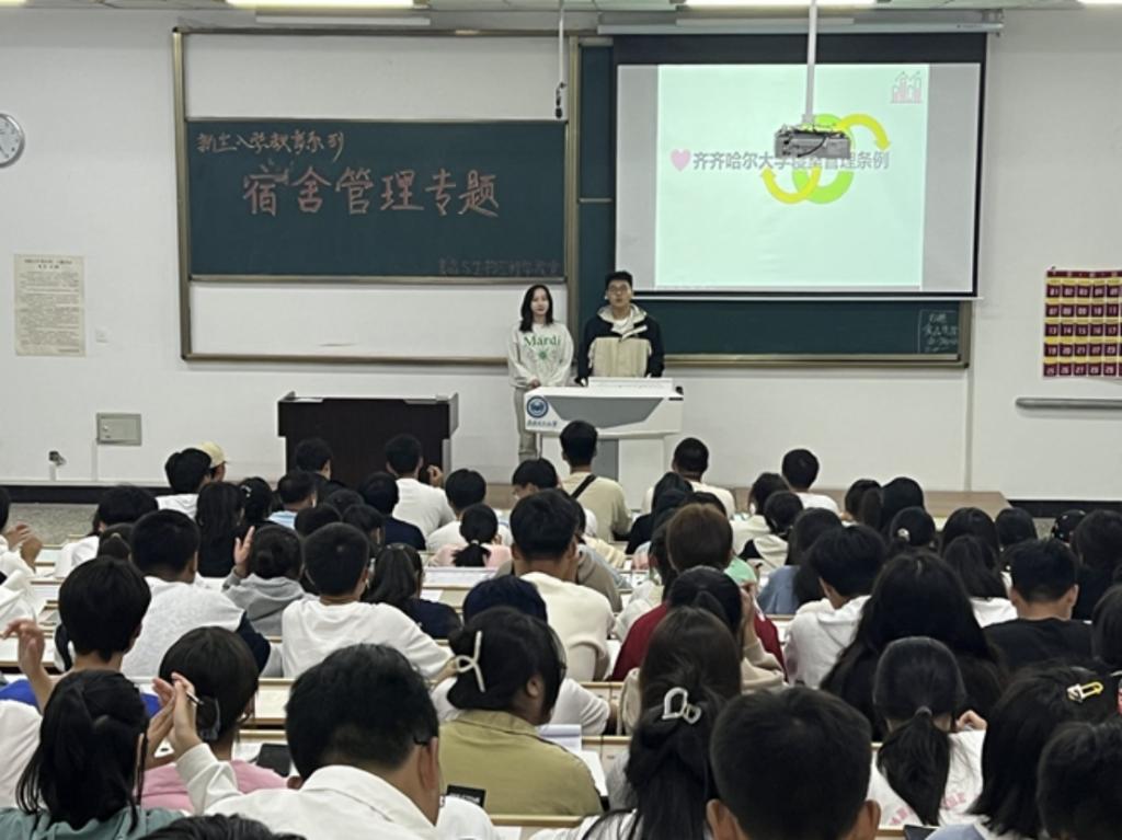 為進一步加強我院新生宿舍安全管理,增強學生安全意識,排除安全隱患,切實維護良好的校園秩序,給我院新生營造一個良好、安全的學習和生活環境。我院于2023年9月6日在守正樓103階梯教室組織舉辦新生入學教育系列之“宿舍安全管理”專題講座。主講人為我院學生會紀檢部部長隋赫以及權益部部長王婧函,我院全體23級新生參加。